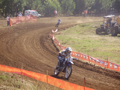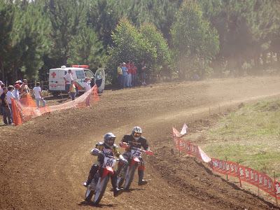 2 - Você irá reduzir um pouco antes da curva e, ao entrar nela, deslocar seu centro de gravidade para frente (sentando quase em cima do tanque), jogar a perna que estiver do lado de dentro da curva para frente, em direção à roda dianteira (não é para pôr o pé no chão, é para aumentar o peso na roda da frente) e calçar o máximo que puder o outro pé na pedaleira. Isso fará com que você aumente o peso na roda dianteira evitando que ela escorregue e manterá seu equilíbrio quando a roda traseira derrapar. Num ponto da curva (você vai ter que descobrir o seu ponto) você começa a acelerar forte. A moto deve escorregar um pouco. Quando alinhar a moto na reta, você já deve estar voltando para a posição em pé, jogando seu peso na roda de trás para dar mais tração à roda traseira. A vantagem é de você sair forte da curva. Com prática, você deve conseguir fazer mais rápido do que a outra, mas você precisa de espaço para isso. Se estiver no corpo-a-corpo e seu adversário souber fazer a outra curva, é provável que você fique para trás.