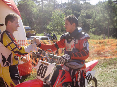 Isso vale para as trilhas de final de semana, provas de Enduro FIM, Cross Country e provas curtas. Nas provas de rally, a posição de pilotagem é outra. Pilotando em pé, você vai sentir menos as "imperfeições" do terreno. Por exemplo: passando num atoleiro, sua moto escorregou feio. Sentado, sua bunda e suas pernas são jogados para o lado fazendo com que você perca equilíbrio, pois seu tronco ficou no mesmo lugar. Estando em pé, seu corpo todo seria deslocado, mas você ainda estaria mantendo equilíbrio. Parece estranho, mas, com o tempo, você verá que isto é um fato. A posição ideal é: Joelhos levemente dobrados, as pernas segurando a moto, coluna levemente inclinada para frente e cotovelos dobrados, voltados para cima. Com a moto parada, sua posição deixa você em pé, equilibrado. Você nunca deve se apoiar no guidão, seja jogando ou segurando seu peso. Você SEMPRE deve estar apoiado nas suas pernas, não nos braços.
